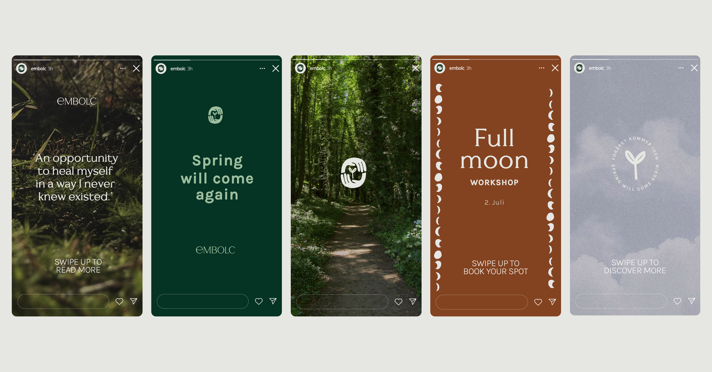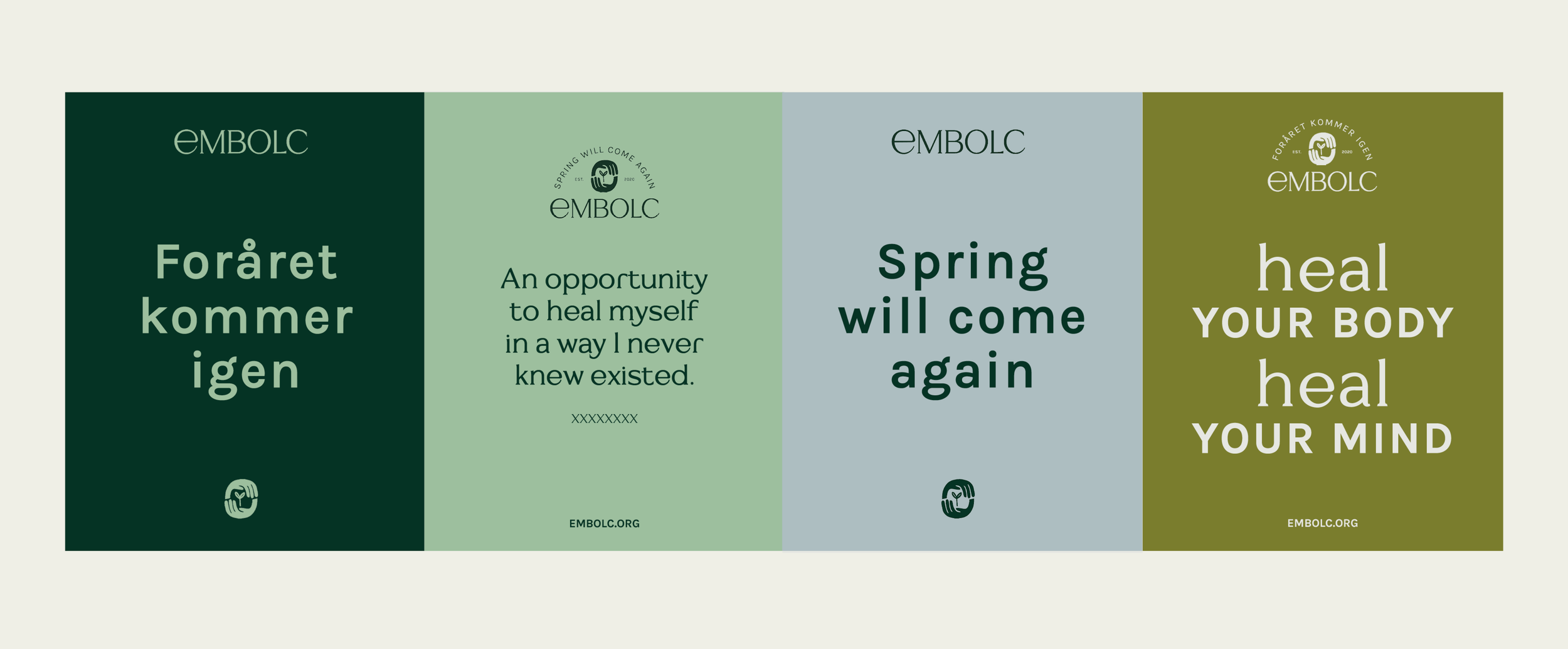 A Danish organisation with a holistic approach to trauma healing, and a mission to be the light that shines in the darkness for those struggling with mental health. Embolc look to treat the body, psyche, mind and soul as a unified whole rather than separate entities - so the notion of balance and cycles was at the centre of this visual identity.